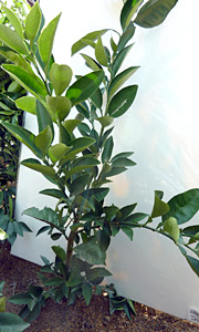 対策としては、「寒冷紗」なければ使い古しの綿シャツやTシャツ等の風を通すものをみかんの木の上から全体が隠れるように覆います。木が大きくなるまで毎年霜よけを行って下さい(木がまだ子供なので、冬を越す体力が無いんです)霜が直接みかんにあたると木が枯れる原因になります。霜よけしなくても大丈夫な地域もあると思いますが、高知でも(ここ土佐市は 太平洋まで車で10分位の温暖なところですが)急激に寒波が来るときがあるので、お客様には必ずお伝えしています。自信の無い方は霜よけして下さい。